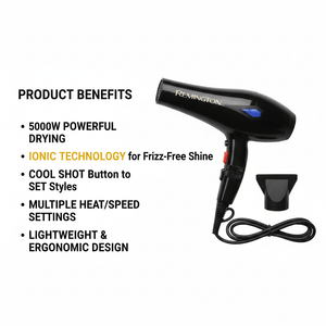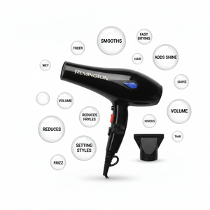 The Remington 5000W Hair Dryer delivers powerful airflow for fast drying and salon-style results. It is ideal for both home and commercial use.Overview